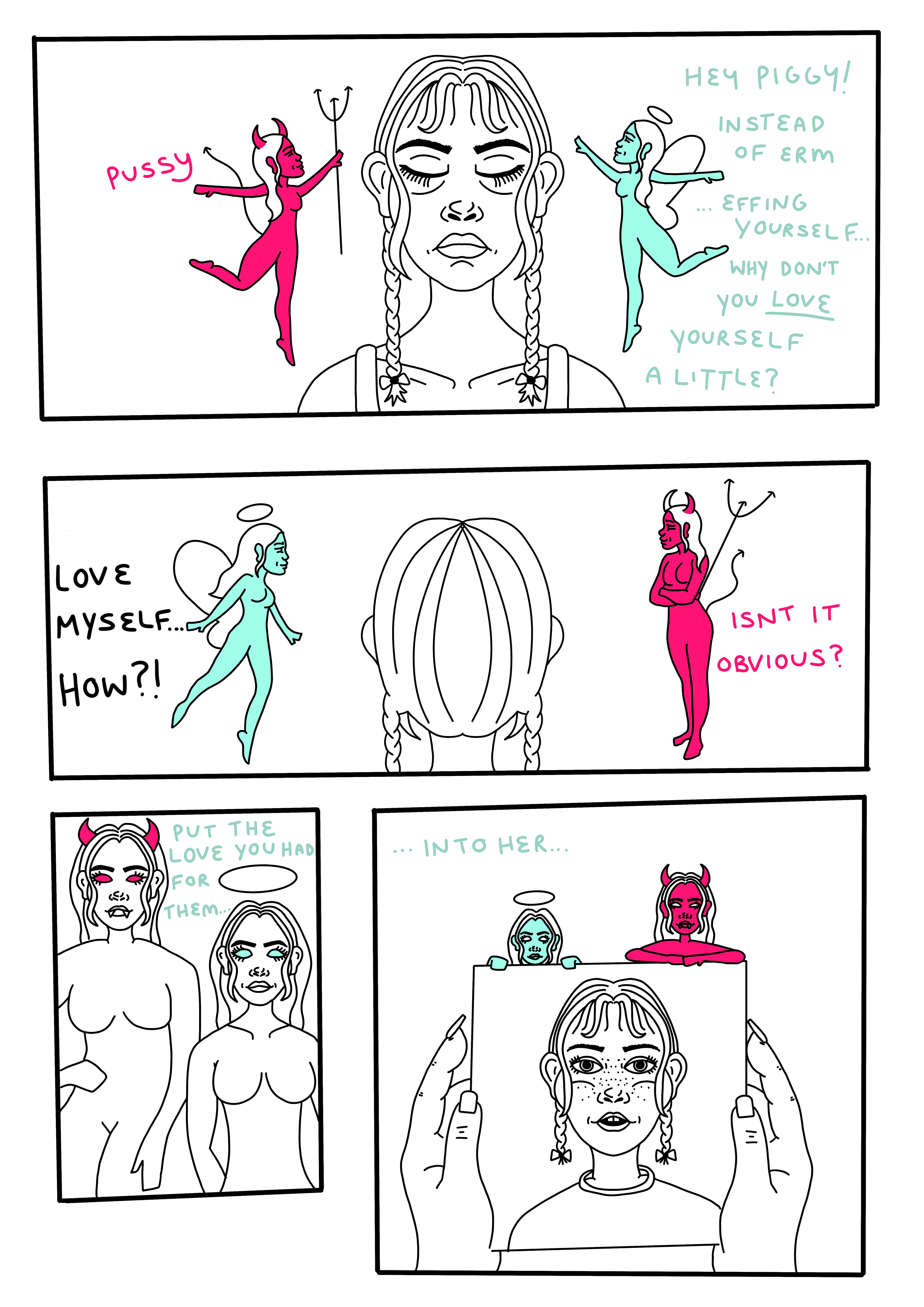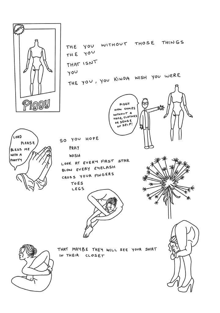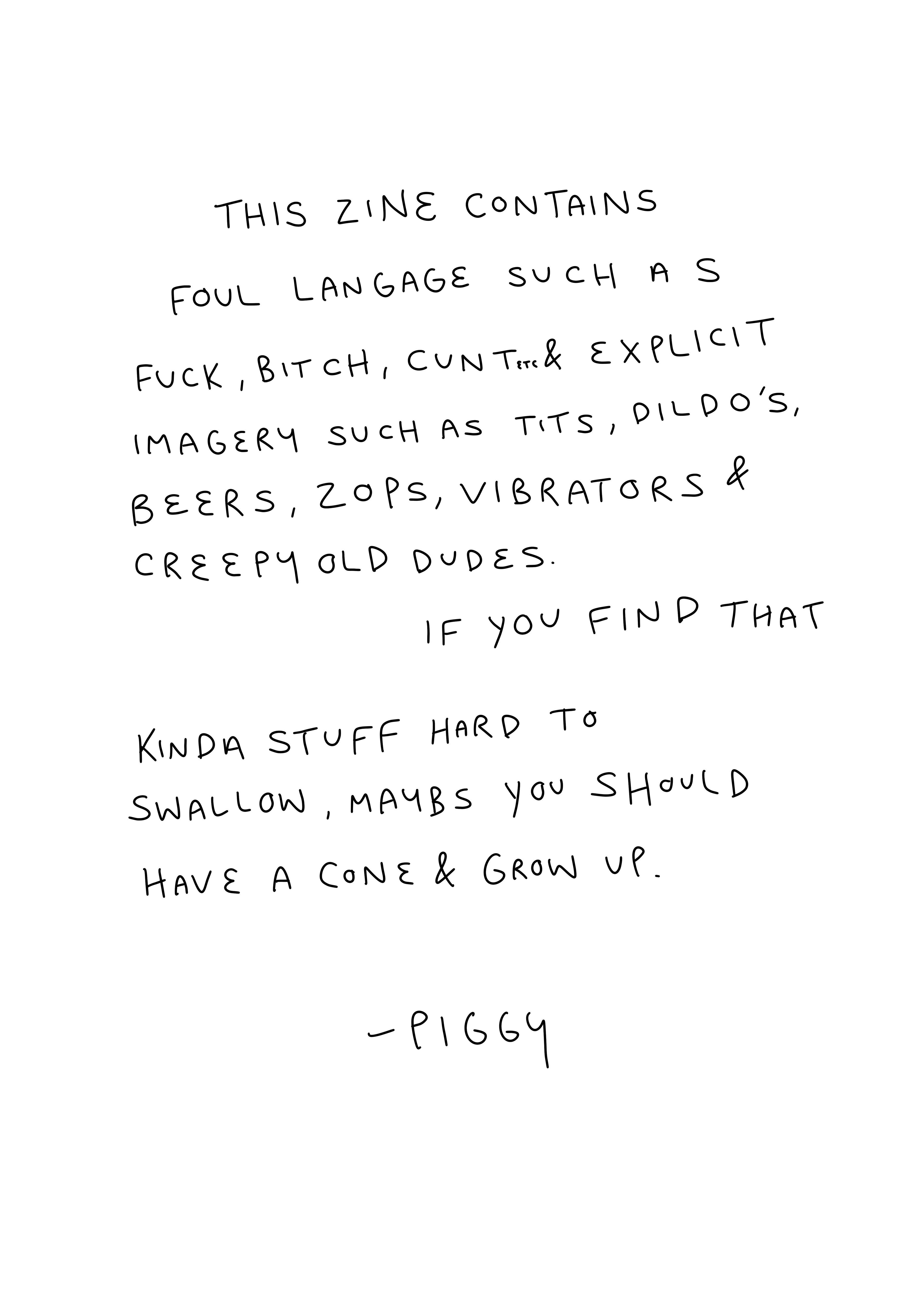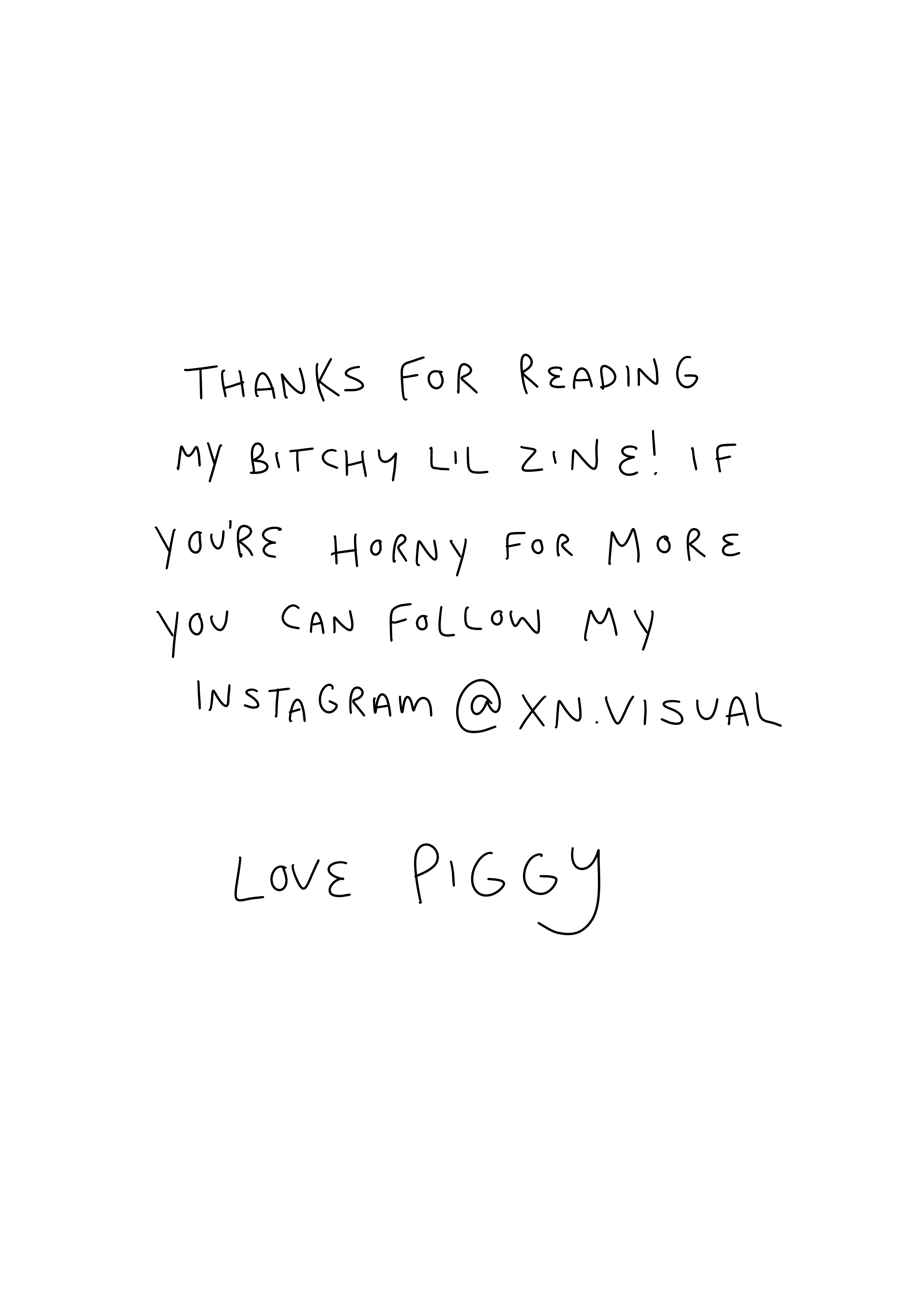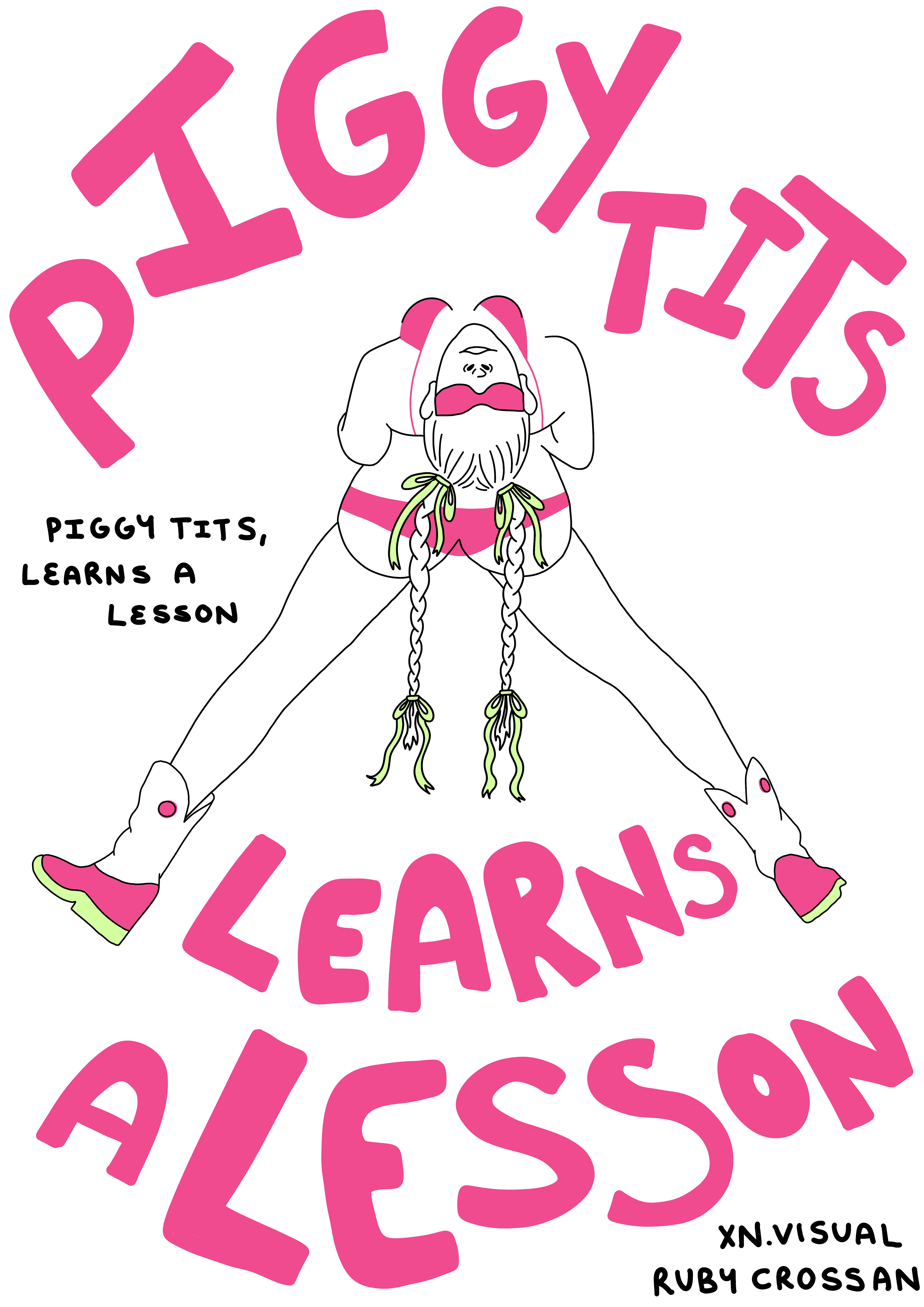 Piggy Tits is a self-published zine series comprising short stories, visual poetry, comics, and prints. Titles such as Piggy Tits, Piggy Tits, Bitch, and Piggy Tits Learns a Lesson showcase my exploration of sexuality, grief, depictions of abuse, modern friendships and girlhood.