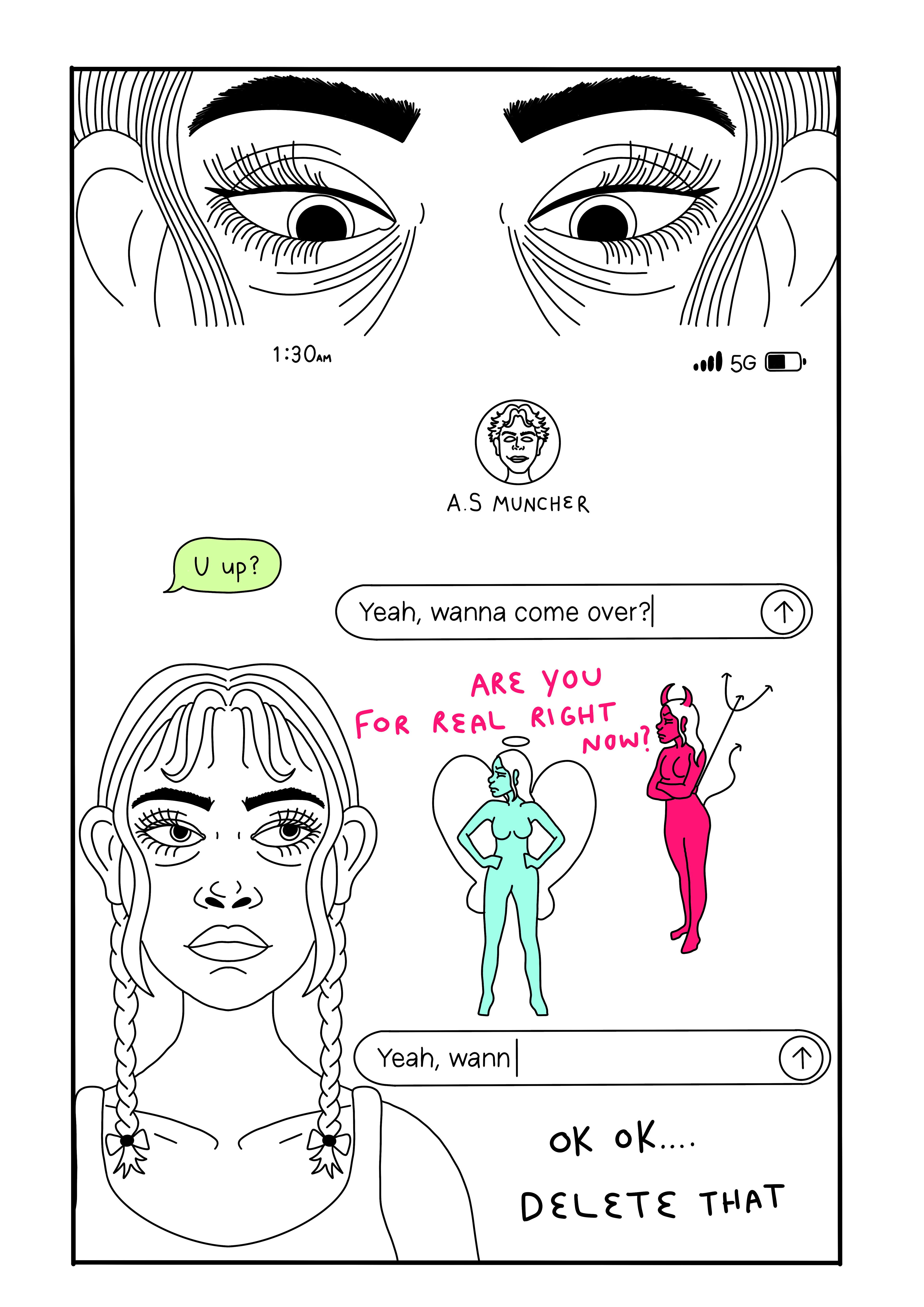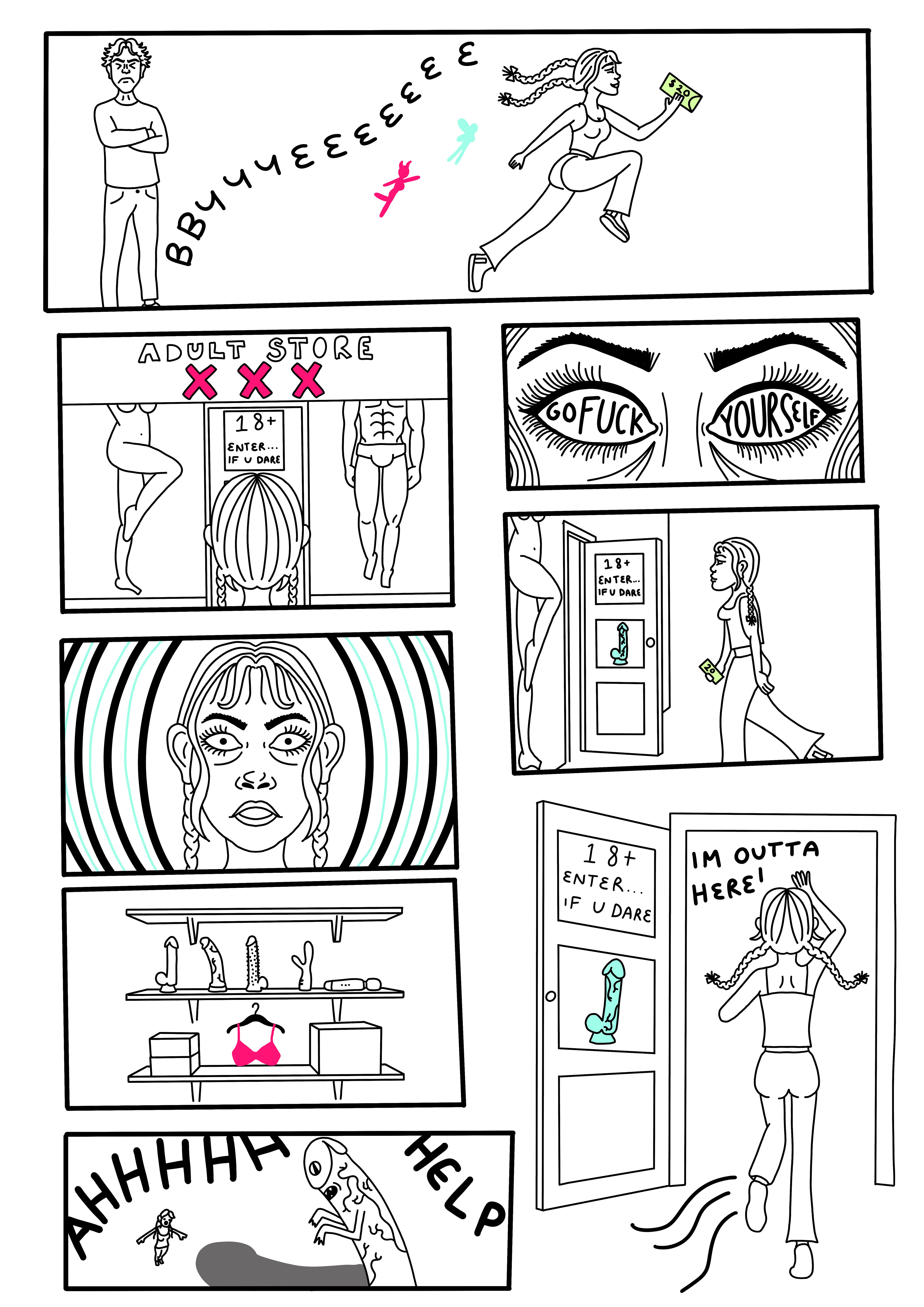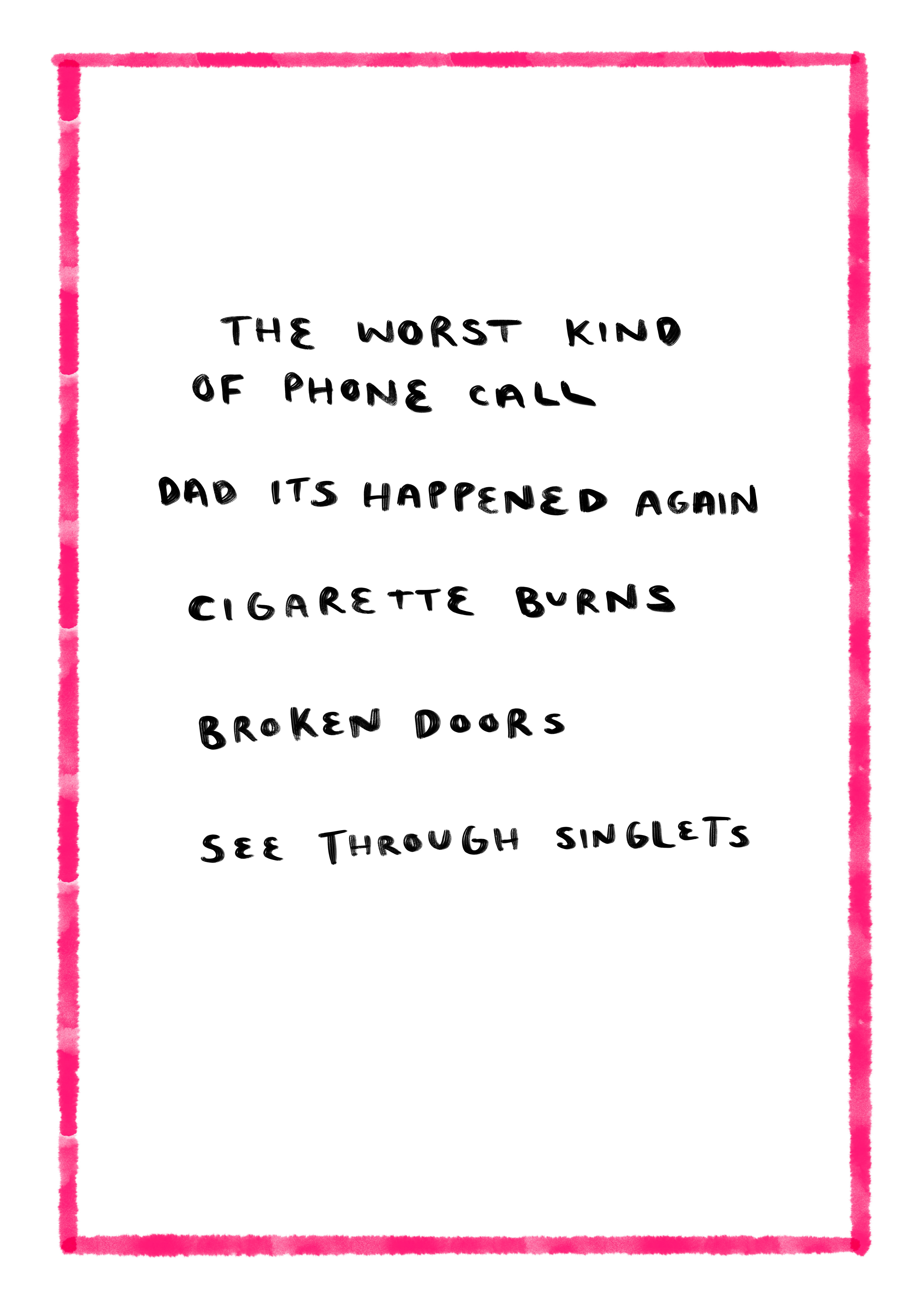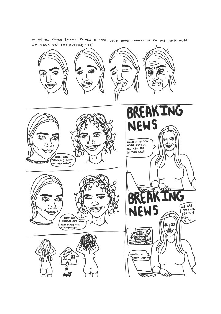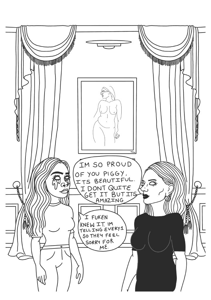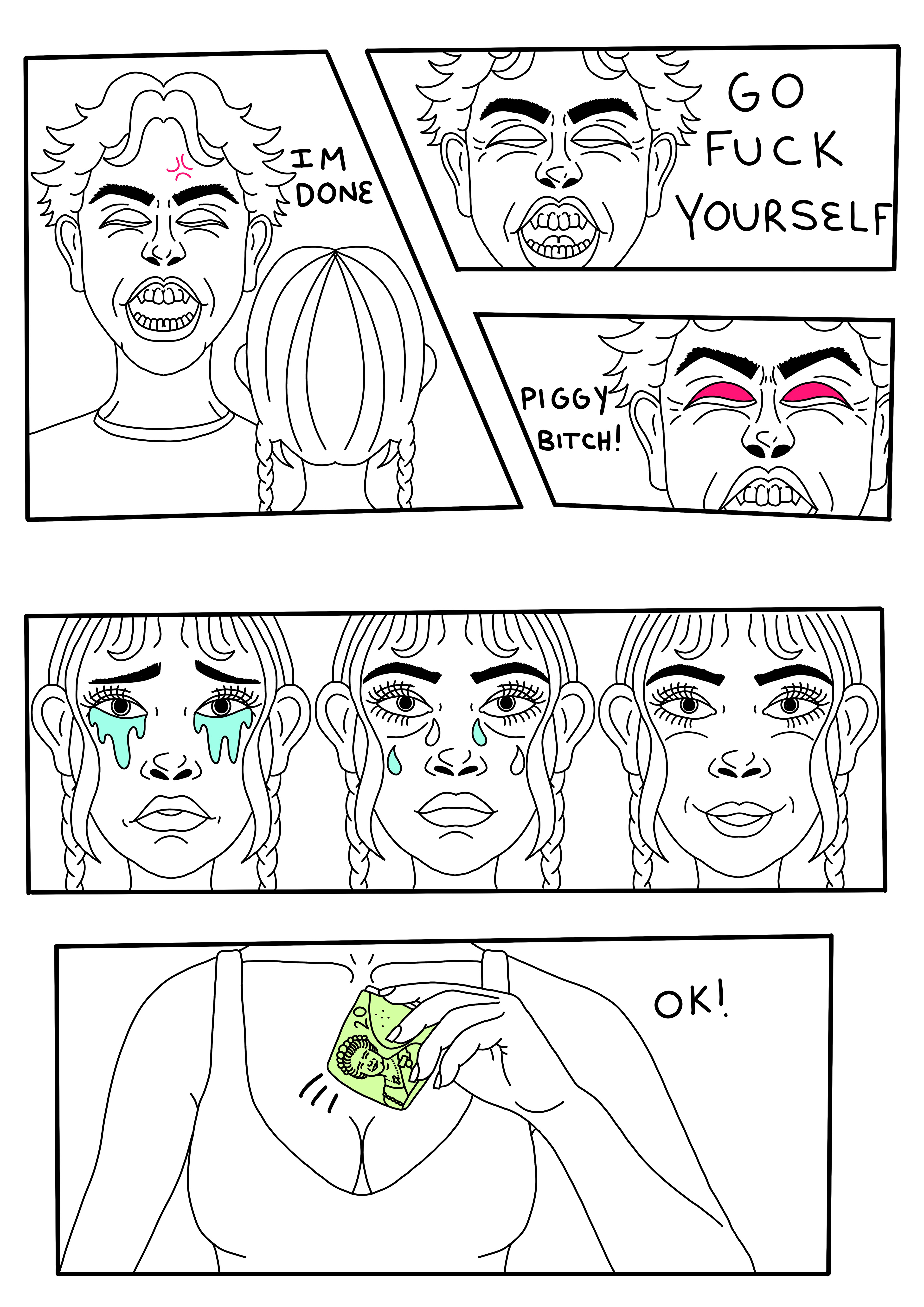 Piggy Tits is a self-published zine series comprising short stories, visual poetry, comics, and prints. Titles such as Piggy Tits, Piggy Tits, Bitch, and Piggy Tits Learns a Lesson showcase my exploration of sexuality, grief, depictions of abuse, modern friendships and girlhood.